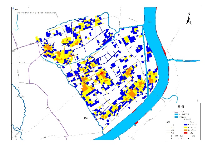 图2 上海市城市街区尺度模型网格通道和典型方案模拟洪涝风险要素分布图