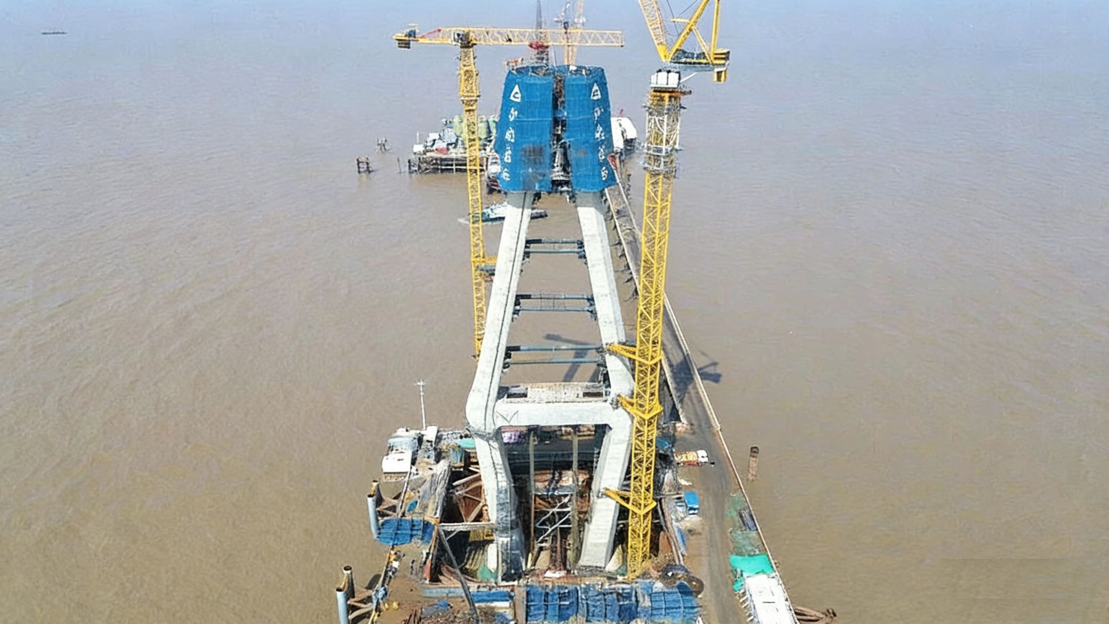新建通甬高铁杭州湾跨海大桥全长29.2公里,是目前世界上长度最长、建设标准最高的跨海高速铁路桥梁工程。南航道桥为主跨364米的双塔斜拉桥,为全线控制性工程。本次合龙的南主塔为钢筋混凝土结构,总高157.5米,其中中、下塔柱高105.5米,采用混凝土双塔肢结构;上塔柱为索塔锚固区,高52米。